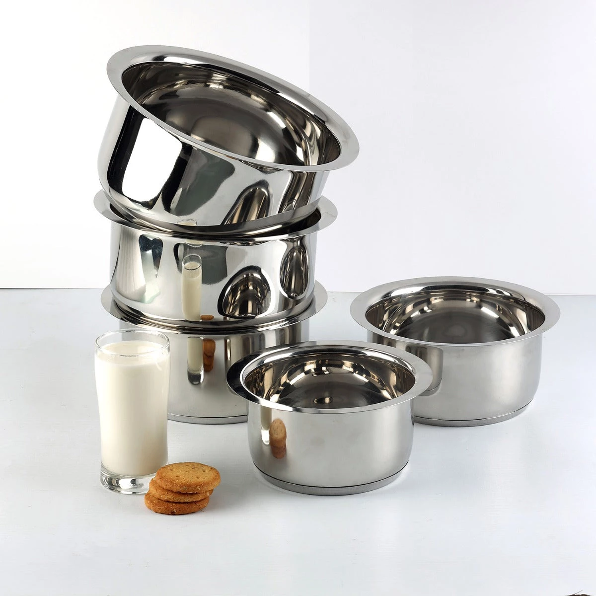 Made in India and crafted from the finest quality stainless steel this 5 piece set consist of a 0.8Â litre, 1Â litre & 1.4 litre, 1.8 litre and 2.2 litre tope without lids. Thick encapsulated sandwich (SAS) bottom, with an aluminum core ensures even heat distribution.