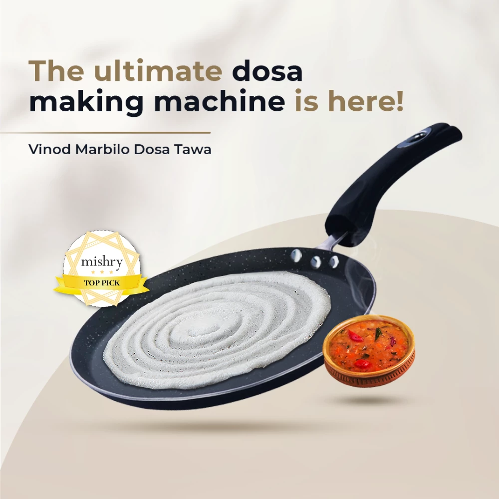 Vinod Zest Marbilo Non stick Dosa tawa is made up of 5 layer coating, making it more durable than ordinary non-stick cookware. It’s special spatter-coated surface looks new for longer and is free from harmful chemicals like PFOA. The thick aluminium helps you cook food without burning and is extremely durable.