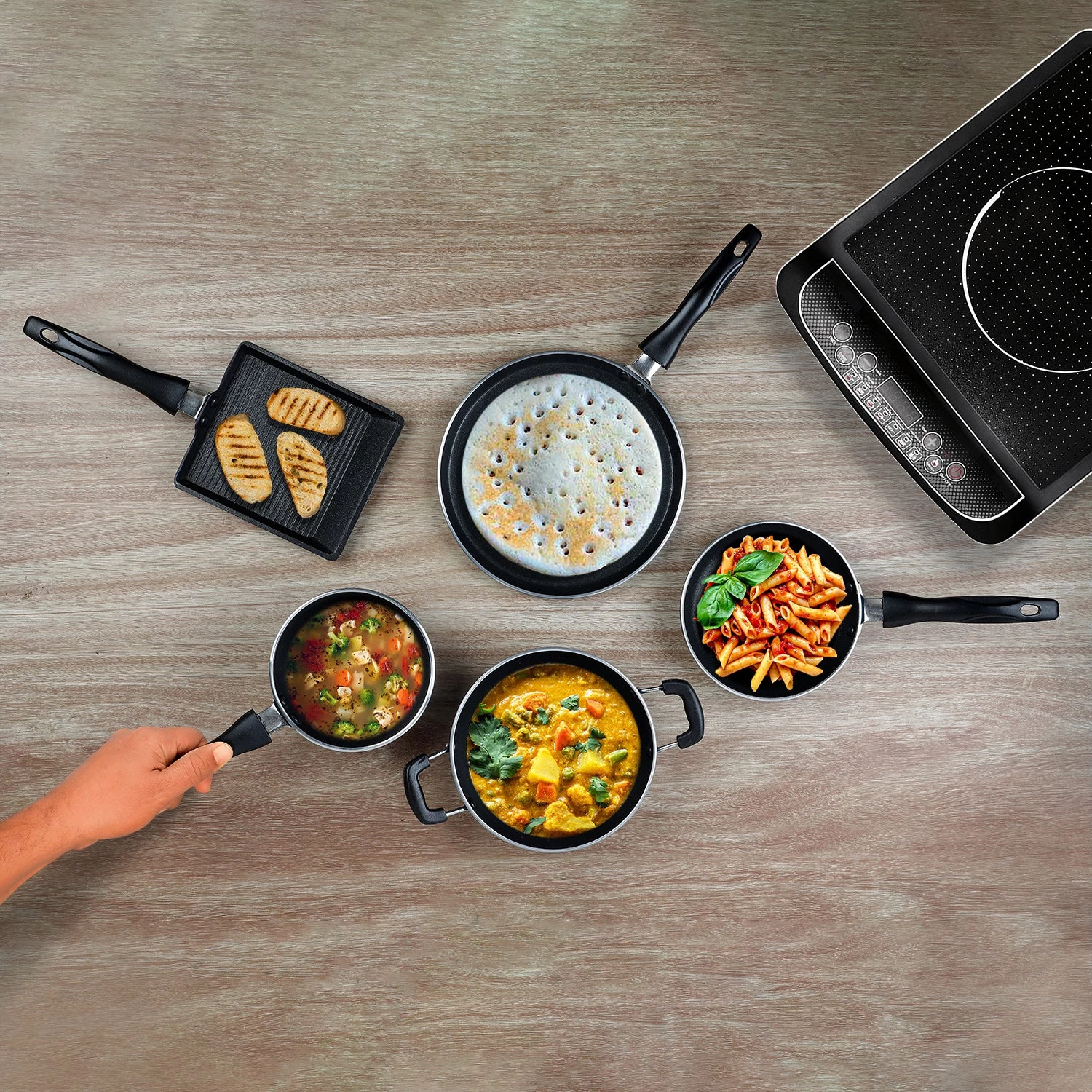 Material: Aluminium Coating: Non Stick Base Thickness: 3mm Base Type: Gas Stove Compatible Triple layered with Swiss technology, scratch-proof and metal spoon friendly non-stick coating PFOA Free which ensures fully non toxic coatings so you can enjoy food absolutely worry free. This set has 3 mm thick 100% Virgin aluminum which ensures even heat distribution and no food burning. Package Content : 1- Piece Non Stick Kadai 16 cm, 1- Piece Non Stick Frypan 14 cm, 1 -Piece Non Stick Saucepan 12 cm, 1- Piece Non Stick Dosa Tawa 20 cm, 1- Piece Non Stick Square Griller Made in India, 12 months warranty.