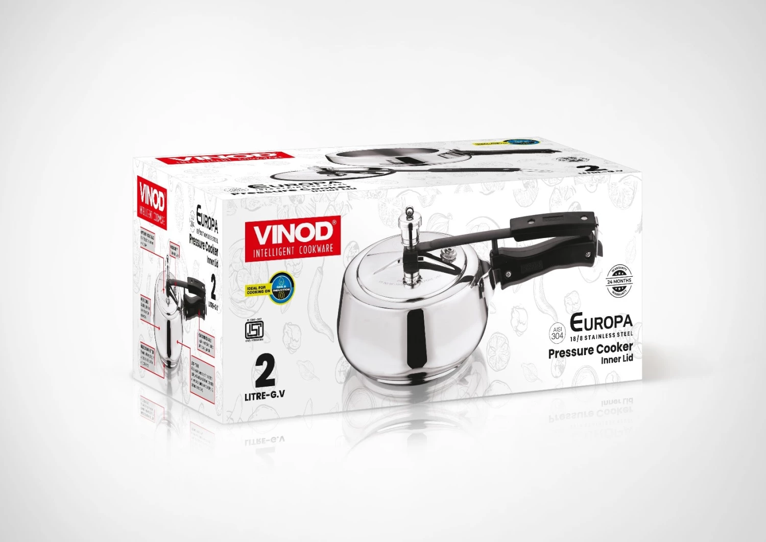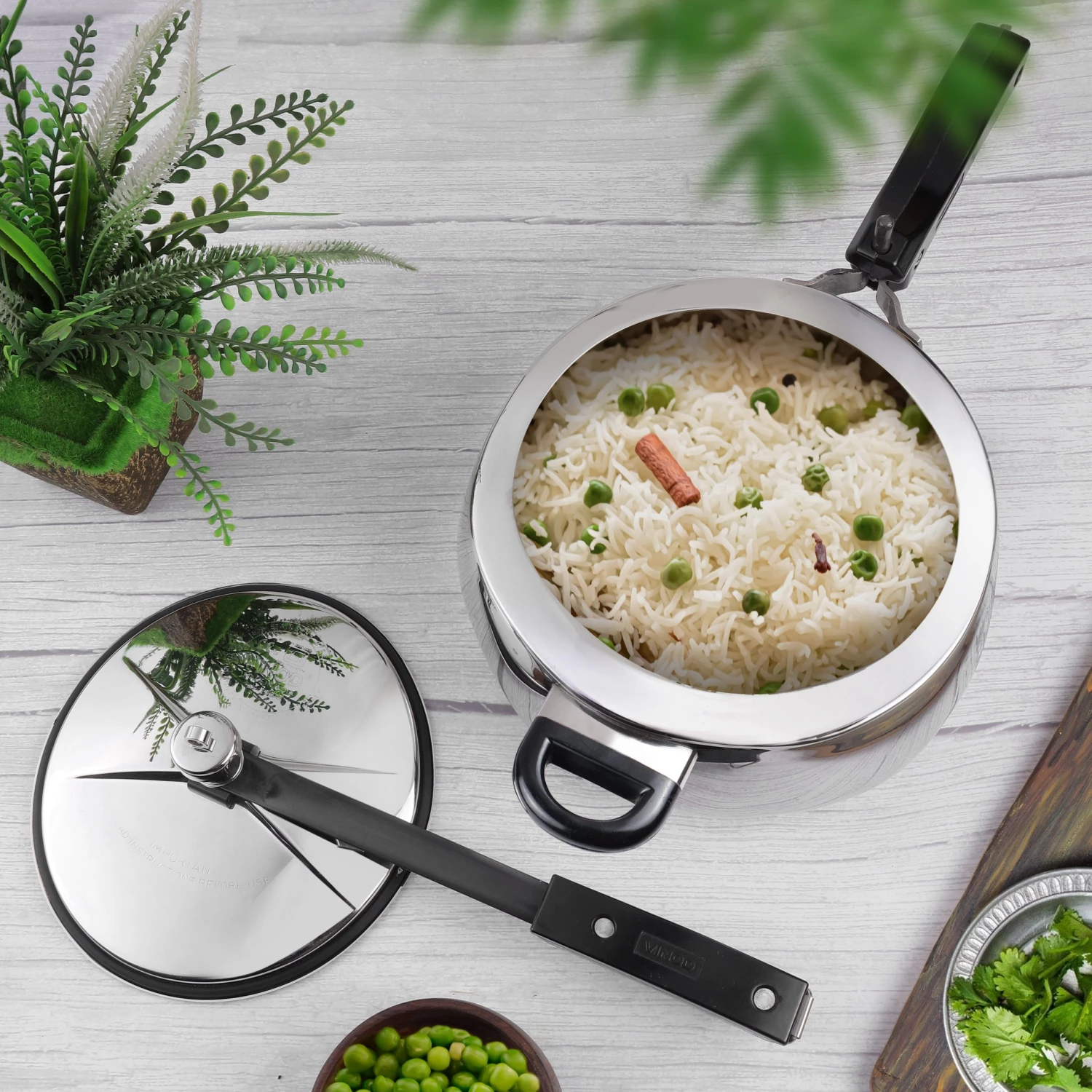Vinod stainless steel inner lid pressure cooker is designed to reduce cooking time. The unique impact bonded 5 mm thick aluminum encapsulated base transfers heat uniformly and more quickly than regular cookers. This effectively reduces cooking time and saves energy too. The fusible valve and gasket release system provides maximum safety to use. The handles provide a safe and firm ergonomic grip which protects your hand from heat transfer while cooking as it stays cool. The cooker is ISI certified made from hygienic stainless steel; Mirror polished; interior and a matt finish base. The inside fitting lid opens only with a fall in pressure. These pressure cookers are built for durability. The handi shaped cooker gives you a wider base helping you optimize your cooking time. The Stainless steel, Aluminum, Stainless steel (SAS) base makes it friendly to use in gas and induction base households. 24 months warranty.