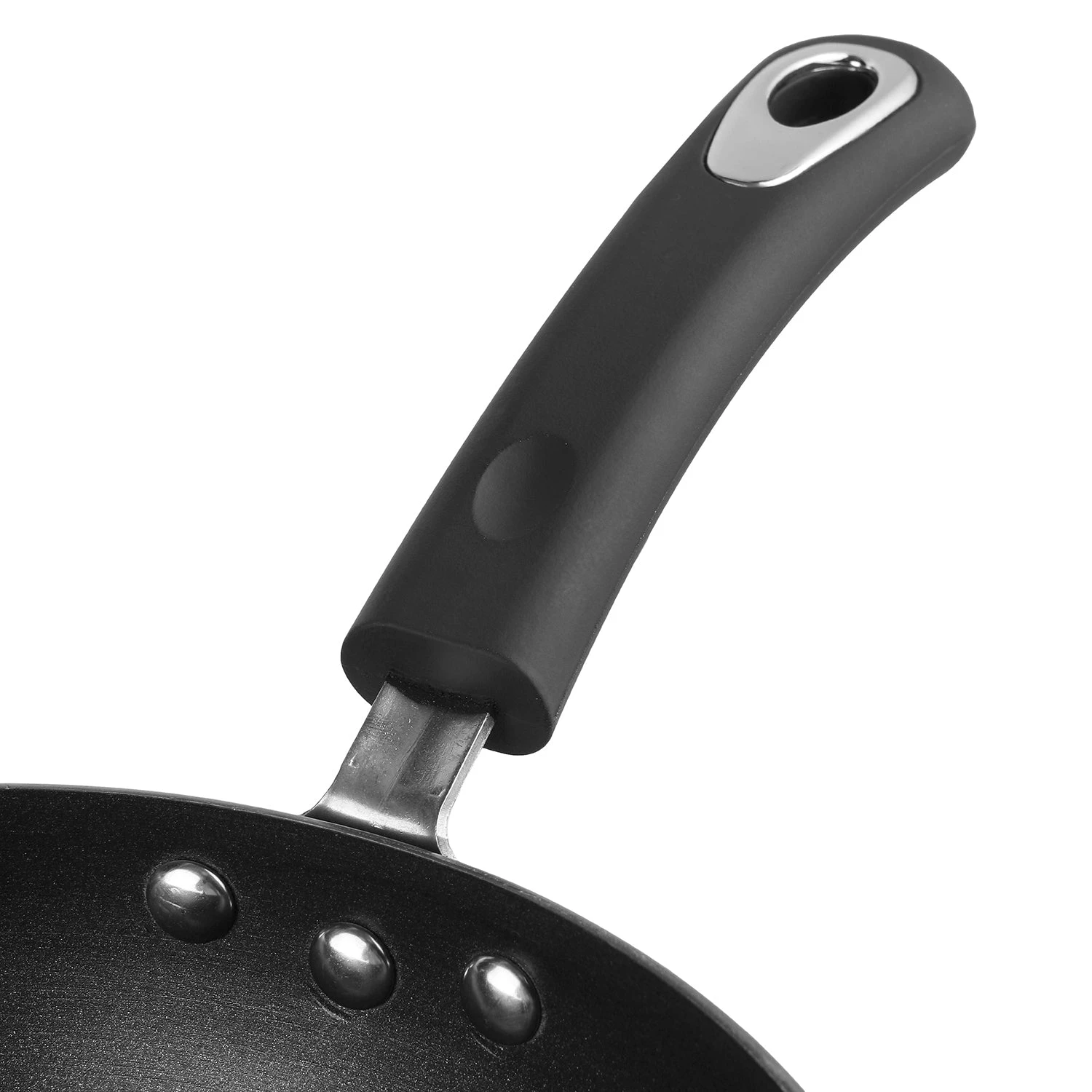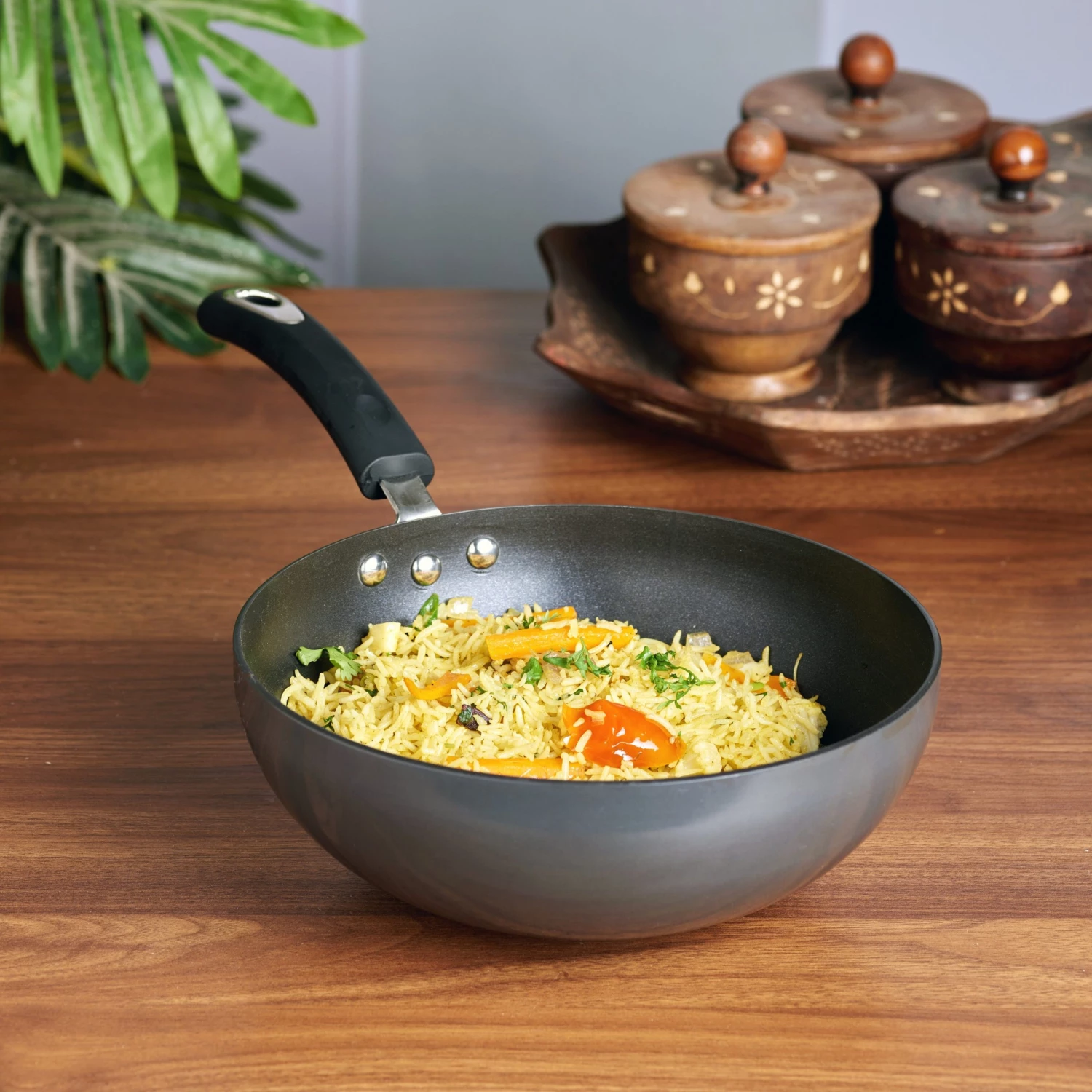 The Hard Anodised cookware comes equipped with triple riveted handle manufactured of 100% Virgin Bakelite which is comfortable to hold with a firm grip and is durable. The round bottom makes this wok ideal for cooking fried rice, noodles or anything that requires good amount of stir frying or tossing. It is also ideal for sautéing and stewing chunks of vegetables, meat and so on. It is compatible with gas stove tops only.