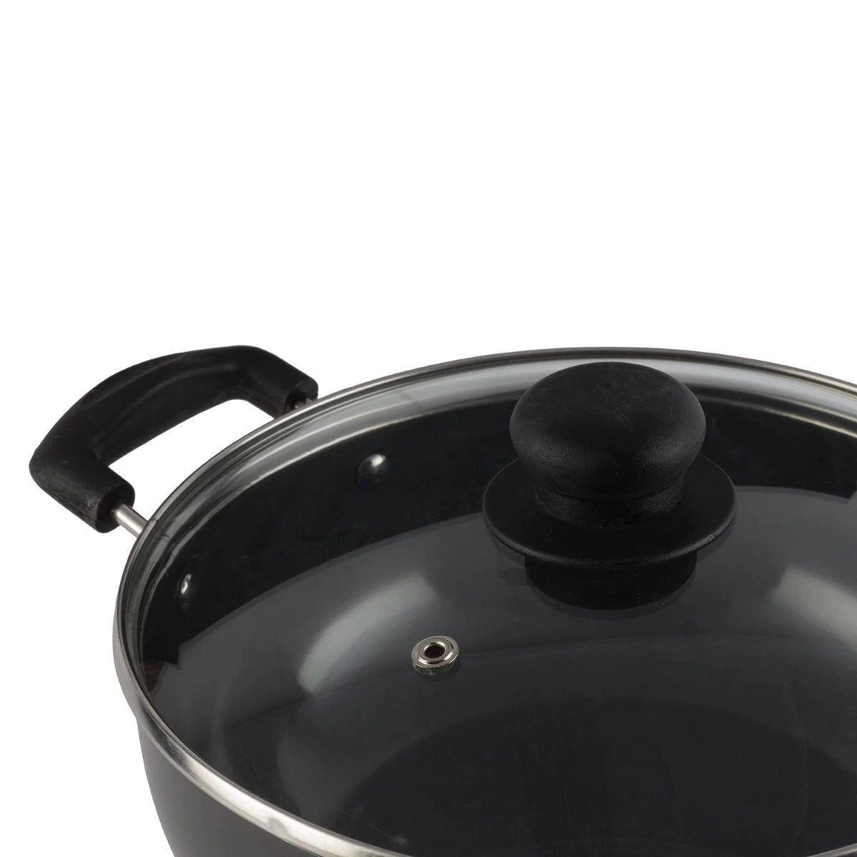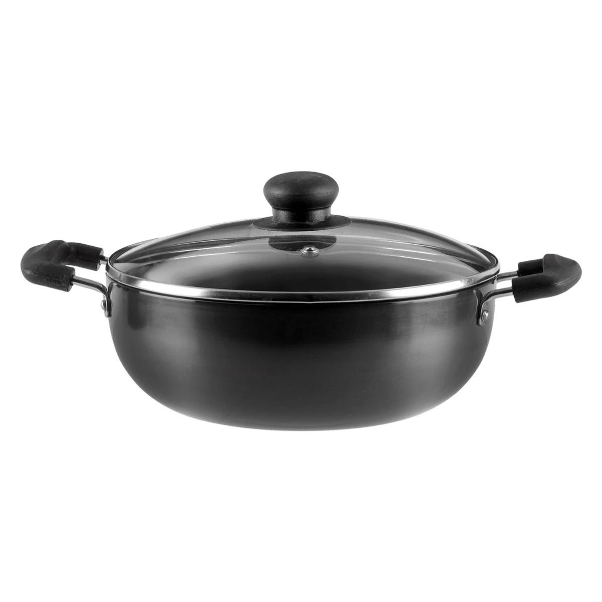 The beautiful, durable black finish which is hard anodised virgin Aluminium has two benefits i.e., it makes the cookware absorb heat faster, making it more energy efficient and the cookware stays looking the same for years.