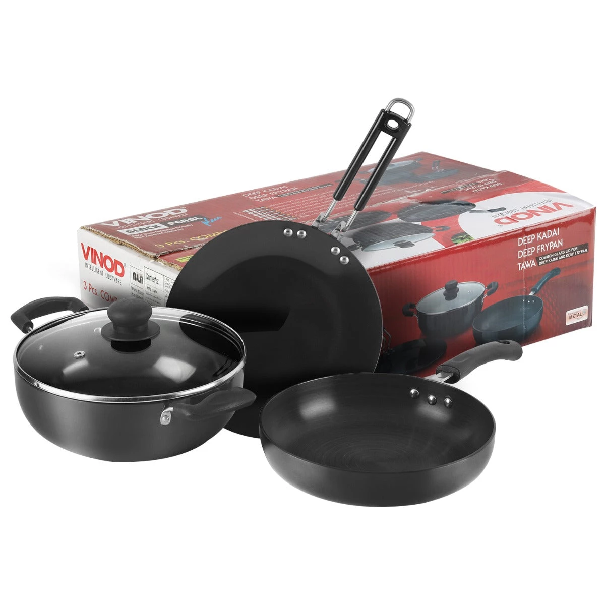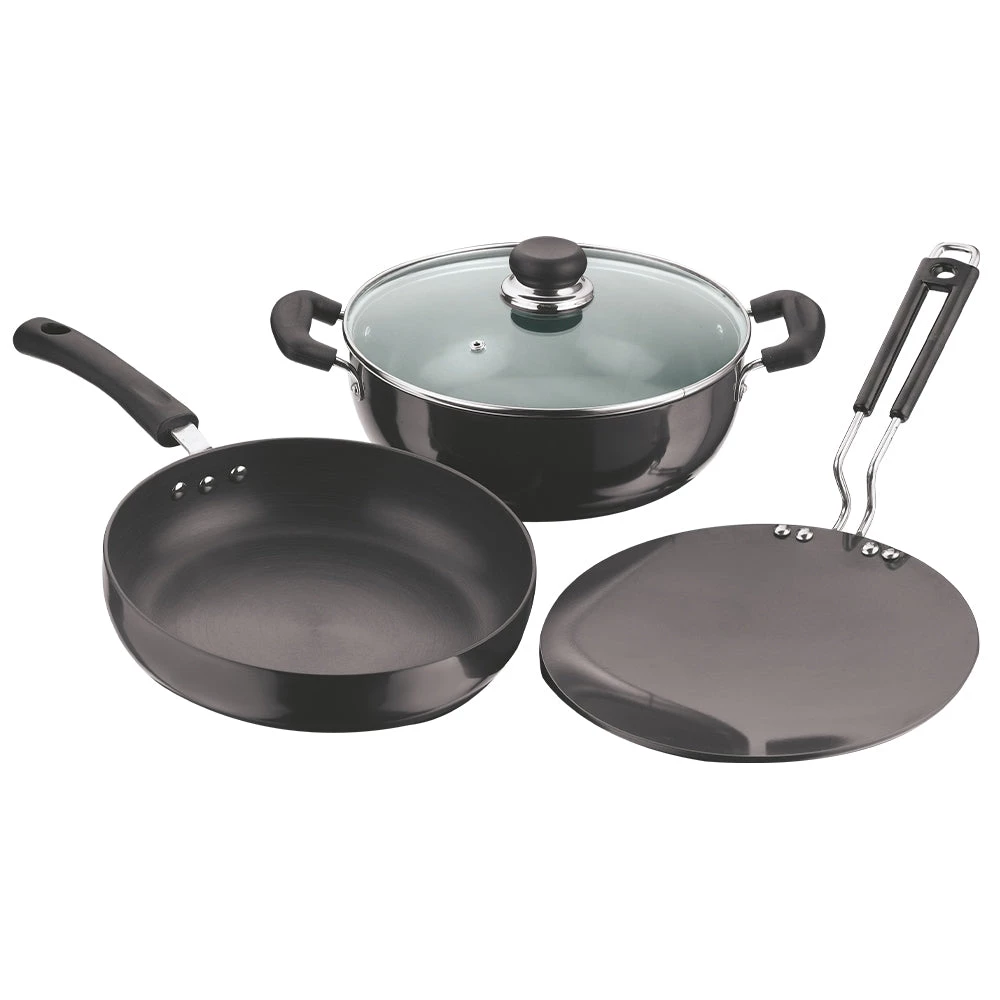 This cookware set has a kadai which ideal for sauteing, deep frying, and for preparing curries and gravies.The frypan can be used for making stir fried vegetables, aloo tikkis, cutlets and much more. The tawa is ideal for making roti/ chapati/parathas or phulkas. This cookware set is compatible with both induction and gas stove top.