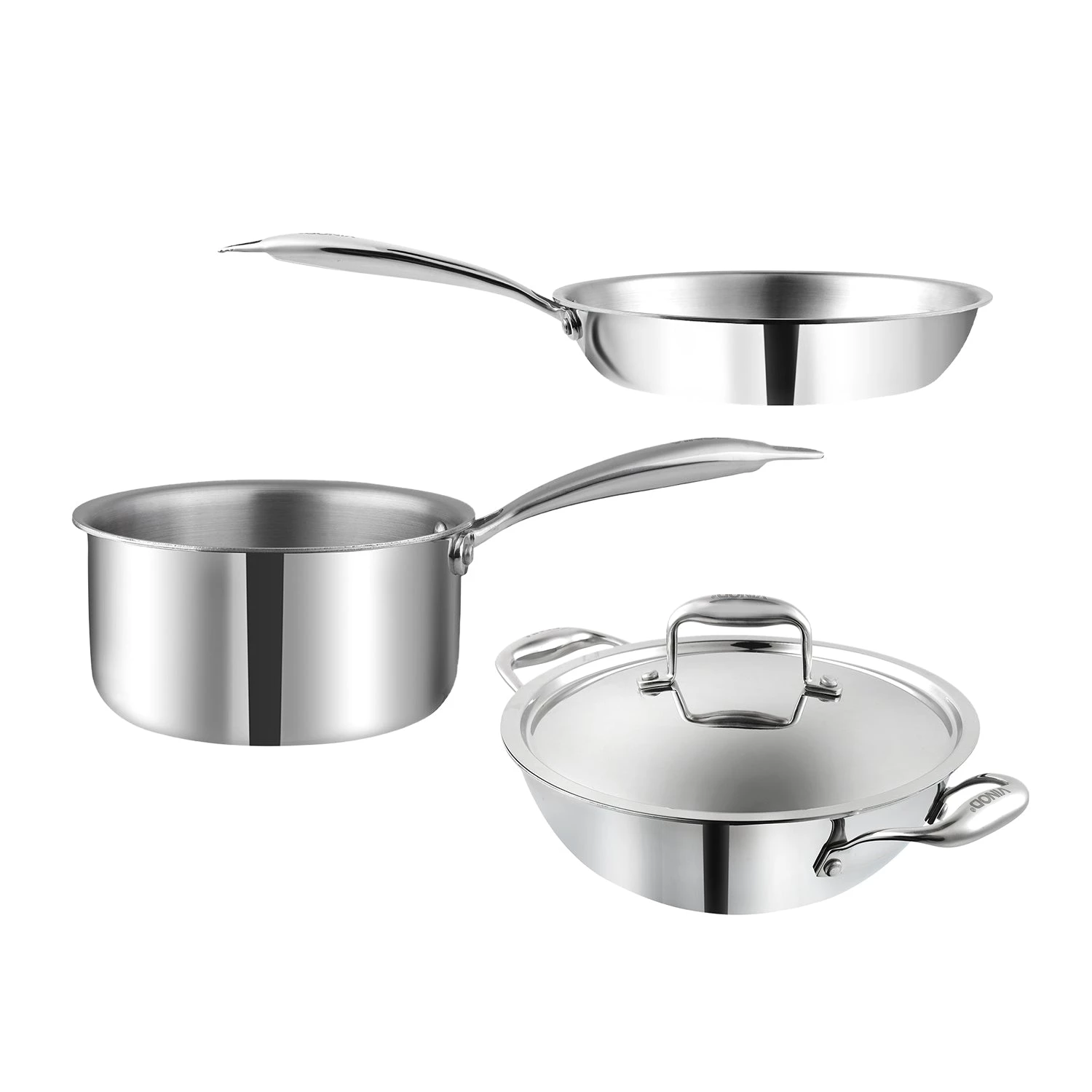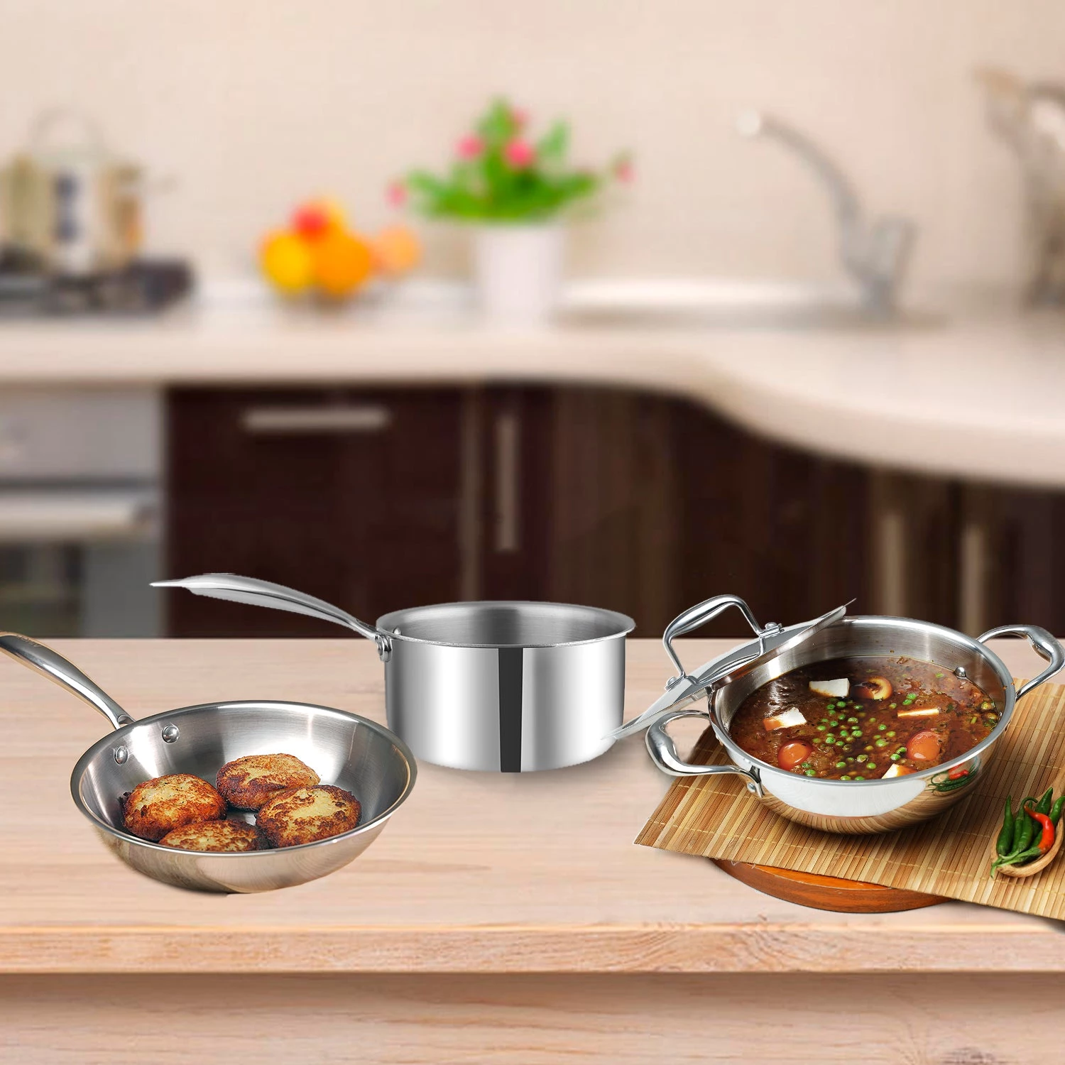 | 3 PC | Extra Deep Kadai With Lid 1.5 Litres (20 cm Diameter), Frypan 20 cm Diameter and Milkpan 1.5 Litres (16 cm Diameter) – Silver (Induction and Gas stove Friendly), Silver |