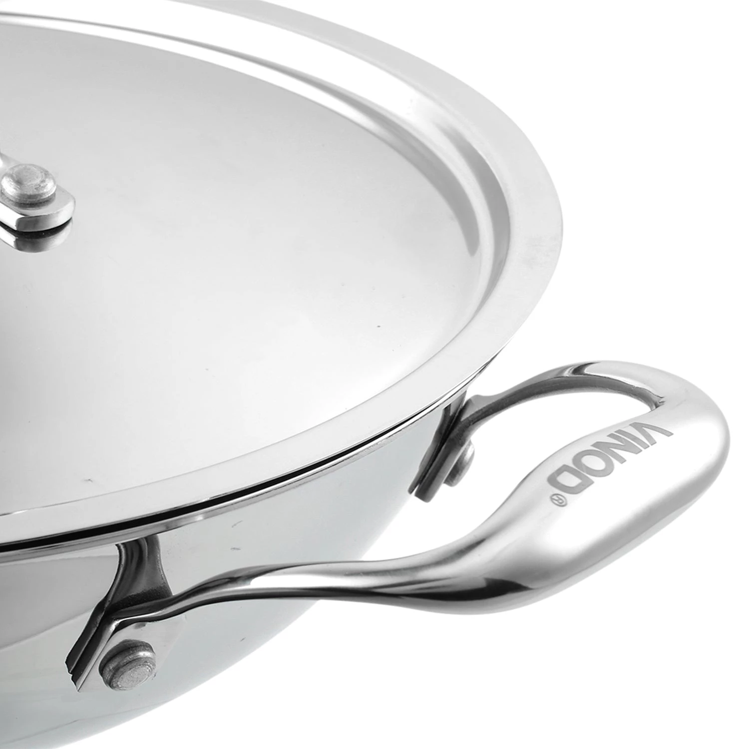 The third layer is made of AISI 430 grade magnetic stainless steel for induction compatibility. The kadai can be used for sauteing, deep frying, and for preparing curries and gravies.Â