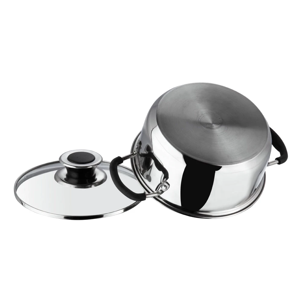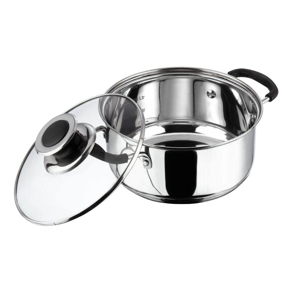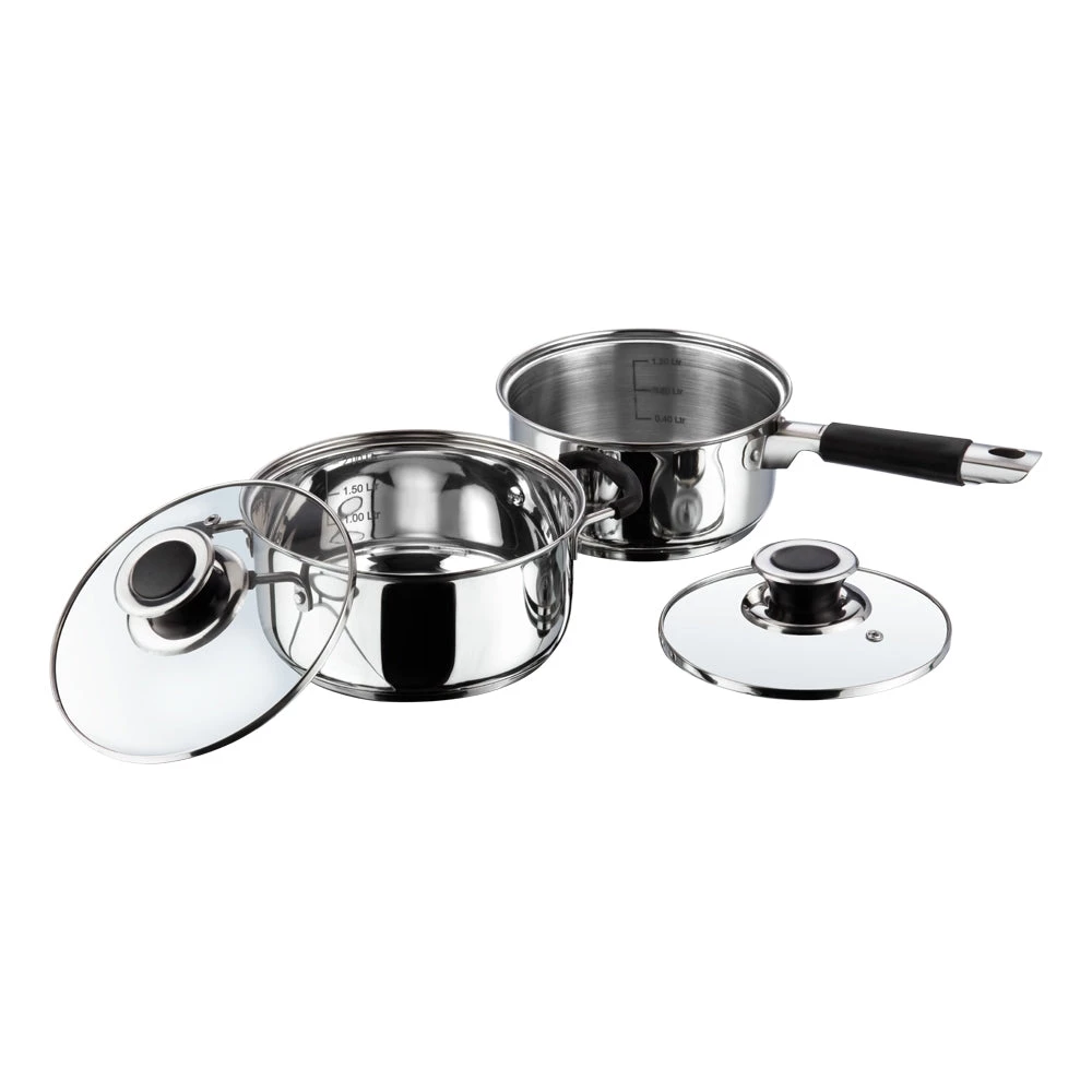 The Master Chef cookware set, true to its name is a asset to any kitchen. All components of this cookware come with a capacity marker making measuring ingredients a breeze. Silicon handles stay cool to the touch and ensure a firm grip when cooking or lifting. While the glass lids with steam vents ensureÂ