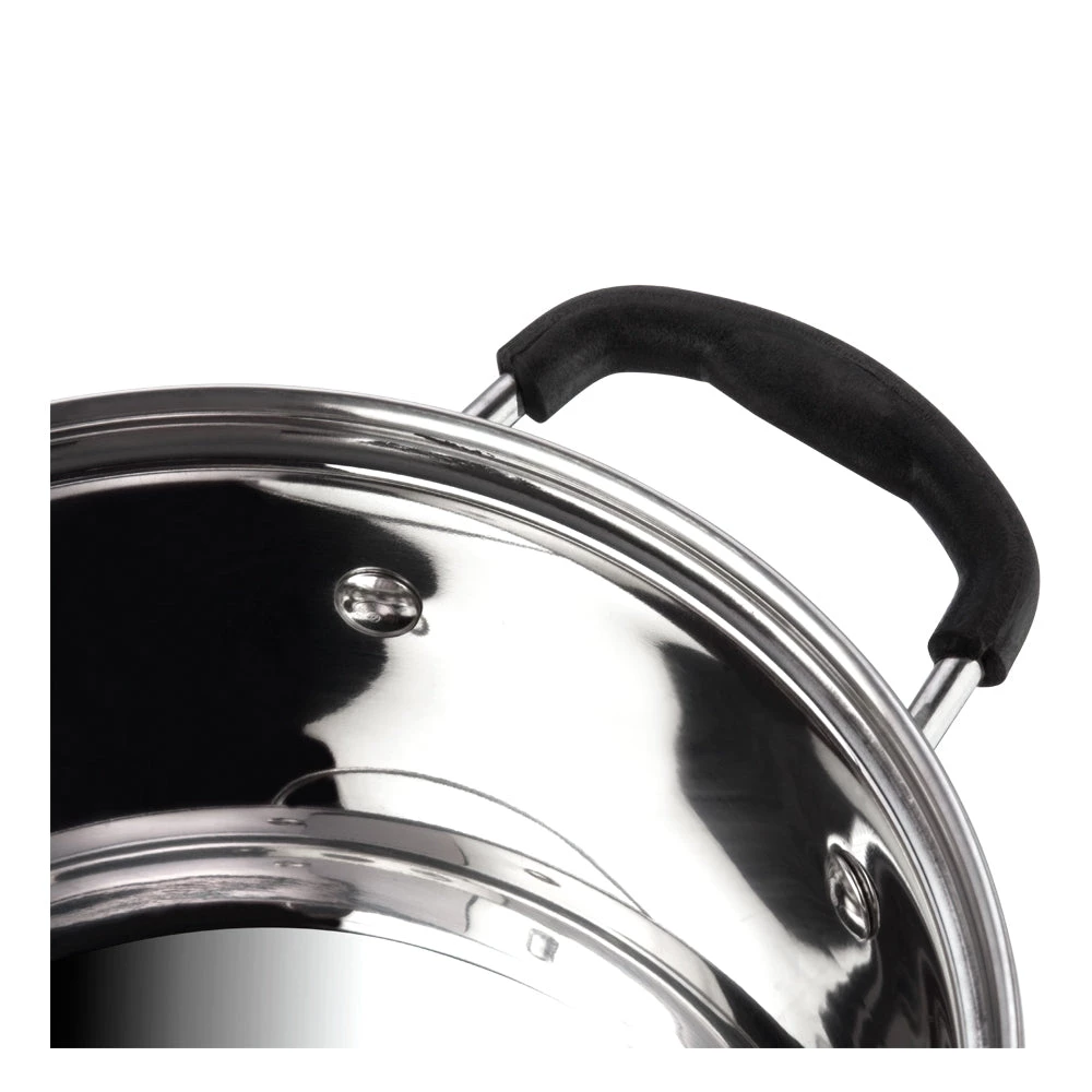 Made from food grade high quality, thick stainless steel for longer use. To ensure uniform and faster cooking an inner layer of food safe AISI 304 grade stainless steel sandwiches a layer of high quality virgin aluminium. The base is a layer of AISI 430 grade magnetic stainless steel makes the cookware induction compatible.