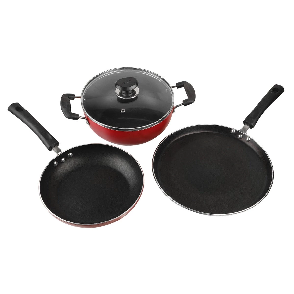 | Contents | 1 Pc – 22 cm Deep Kadai (2.6 L), 1 Pc – 22 cm Frypan, 1 Pc – 28cm Dosa Tawa (4 mm thick) and 1 Pc – Glass lid |