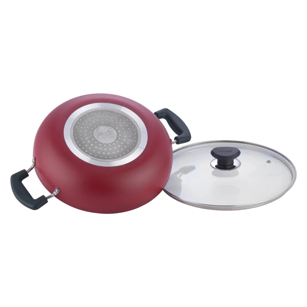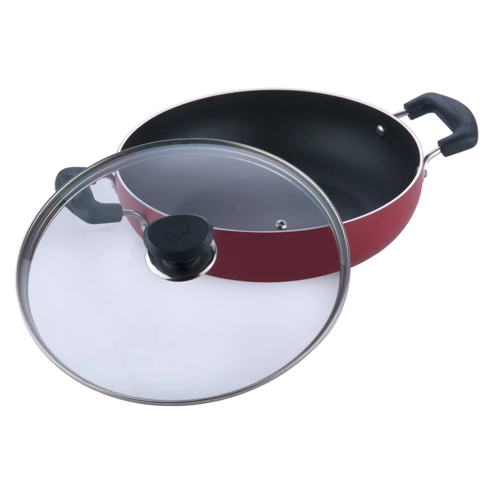 This Vinod non stick kadai with glass lid has a thick aluminium which ensures faster and burn free cooking. It is must have in your kitchen. You can make your food healthier with the help of this non-stick kadai, as it consumes less oil. It comes with glass lid which makes you cook faster and keeps your food warm. The lid also has a steam release vent.